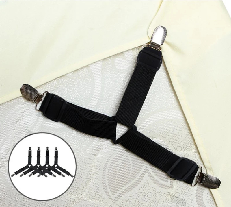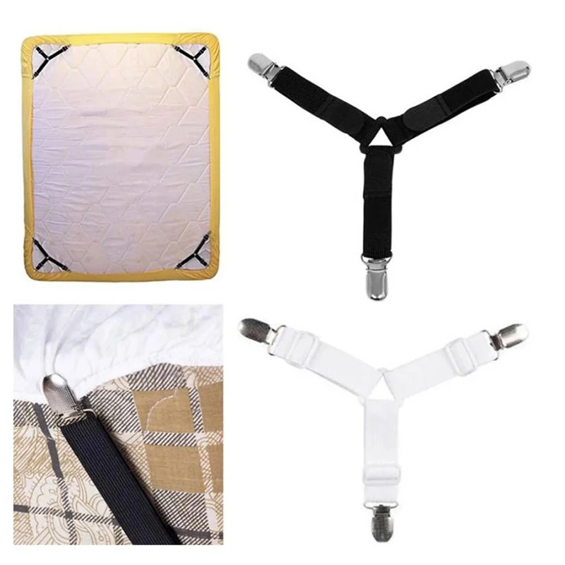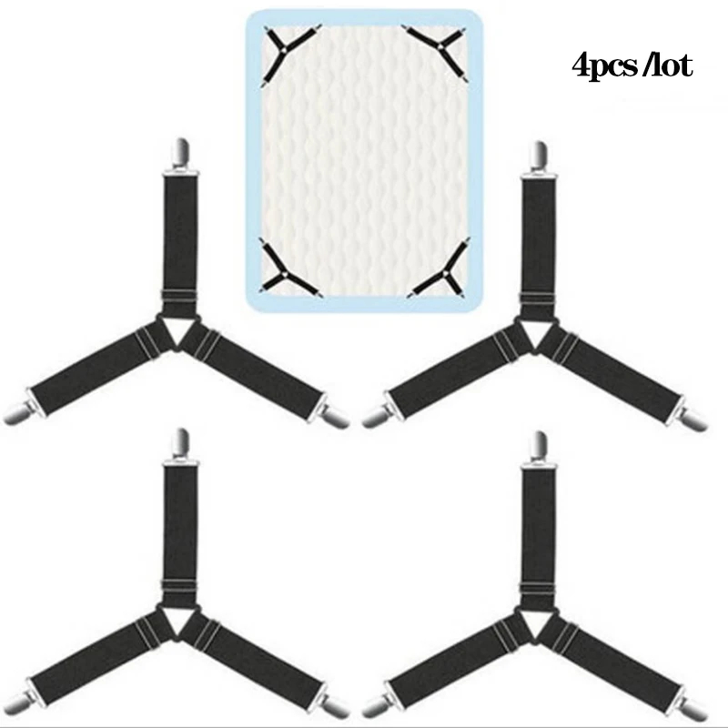 4-Pack Bed Sheet Holders โ Adjustable Elastic Corner Clips (Triangle Straps)