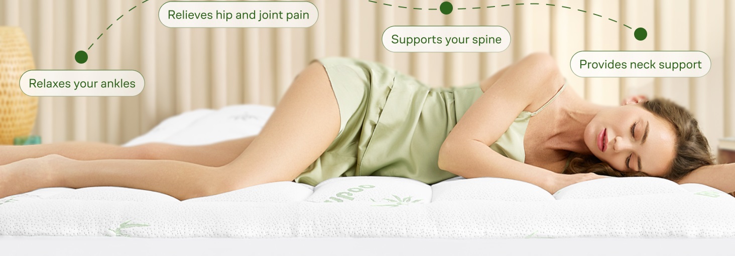 Bamboo Mattress Topper 鈥 Cooling, Soft, and Supportive for Better Sleep Experience a cooler and more comfortable night鈥檚 rest with this Bamboo Mattress Topper. Crafted from viscose derived from bamboo, it combines softness, breathability, and gentle support to help relieve back pain and provide lasting comfort. Perfect for hot sleepers and anyone seeking a refreshing sleep environment. Key Features: Viscose from Bamboo Fabric: Made with bamboo-derived viscose that is naturally breathable, silky smooth, and moisture-wicking for a cool and fresh sleeping surface. Cooling and Breathable Design: Promotes airflow and helps regulate body temperature, keeping you comfortable through warm nights. Back Pain Relief: The soft yet supportive padding reduces pressure on the back, hips, and shoulders, helping relieve tension and improve sleep quality. Soft and Gentle Cover: Features a delicate green fabric that adds a calm, natural touch to your bedroom while remaining soft and skin-friendly. Ideal for Hot Sleepers: Effectively absorbs and releases moisture to maintain a dry, cool, and comfortable sleeping environment. Easy to Maintain: Machine washable and durable, keeping its softness and shape even after repeated use. Enjoy breathable comfort, cooling relief, and gentle support every night with this Bamboo Mattress Topper 鈥 where softness meets refreshing sleep.